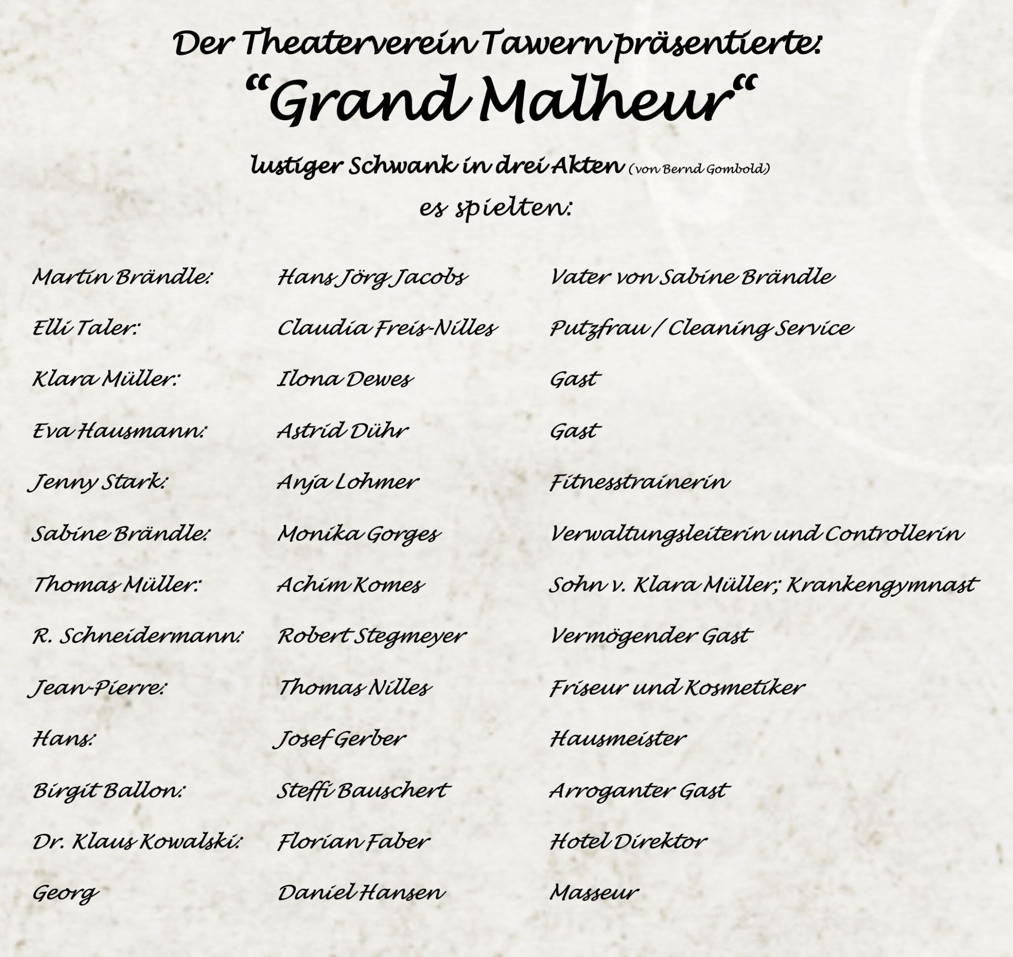 Mit dem Stück „Grand Malheur“ aus der Feder von Bernd Gombold werden die Gäste ins Kur- und Wellnesshotel „Faltentempel“ mitgenommen. Und dass es da wieder einmal drunter und drüber geht, liegt auf der Hand. Zum einen werden neue Gäste erwartet, zum anderen kehren mit der neuen Verwaltungsleiterin und Controllerin Sabine, auch neue Sitten für die Beschäftigten ein. Sabine ist dem Hotel-Direktor Dr. Klaus Kowalski ein Dorn im Auge, denn der Aufsichtsrat hat sie eingestellt, um gewisse finanzielle Unregelmäßigkeiten im Hotel zu klären.